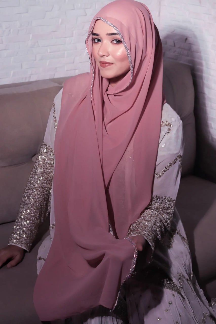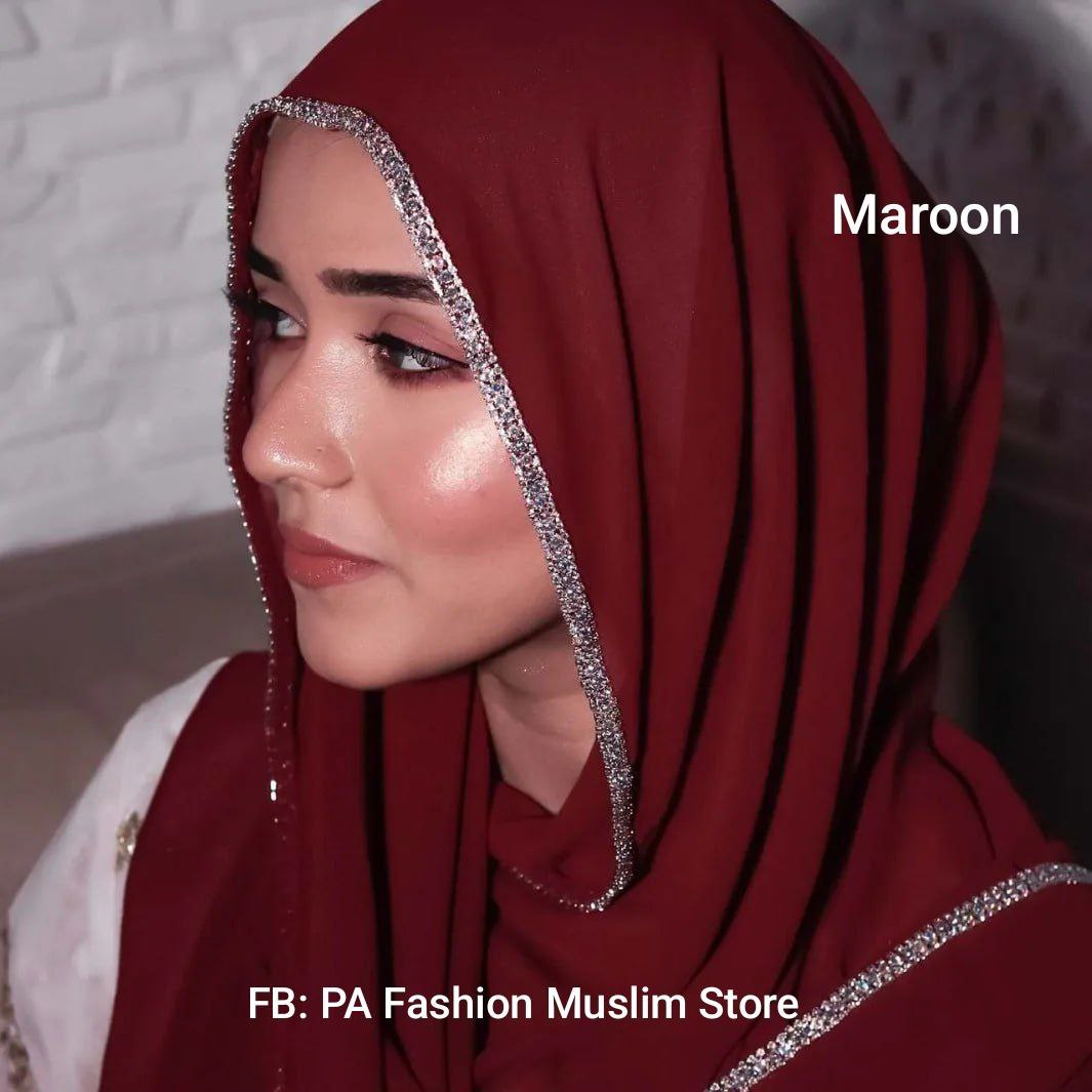 Muslim Cloths is an elegant headscarf with a delicate, shimmering rhinestone trim along the edges, often made of chiffon fabric